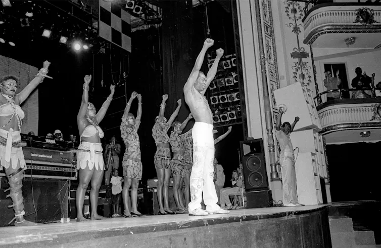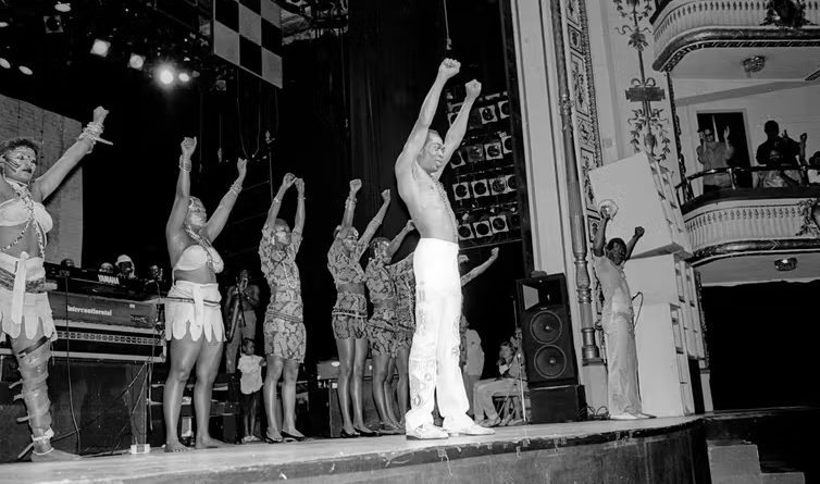 Nigerian musician Fela Kuti and his band in Harlem, New York, 1989.