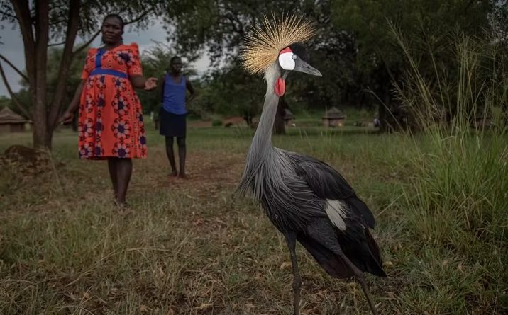 December 19, 2021 Lydia Balidawa poses for a photo with a rehabilitated grey crowned crane at Uganda’s Pian Upe