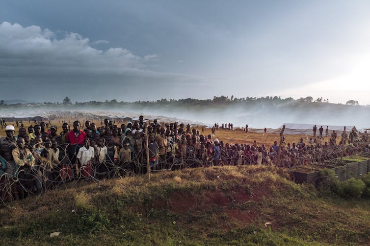 Dozens of displaced people gather along the fence of the MONUSCO base in DRC.
