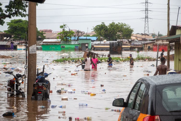 Residents contend with the flooding after a downpour in Accra, Ghana.
