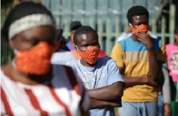 Community members wearing protective face masks as they queue for aid in Zandspruit informal settlement, north of Johannesburg.