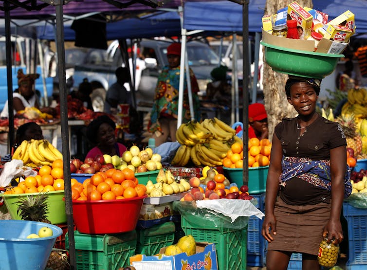A woman walks through a market in Luanda, Angola. People who live in Africa’s cities rely heavily on the informal sector.