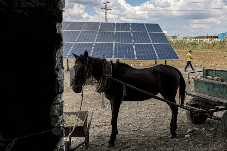 A horse stands before solar panels used to power water pumps along the Afir agricultural irrigation canal in Egypt.