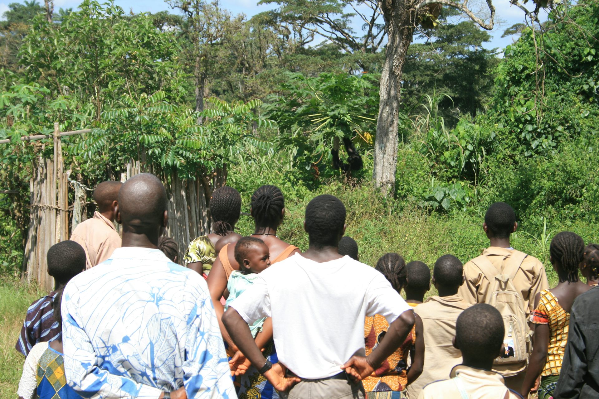 Villagers in Bossou watch chimps carrying out a papaya raid mission.