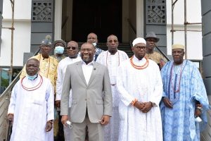 L-R (Front row): The Olor of Useh, Chief R. Olor; Edigin N’Useh, His Royal Highness, Ekpen Edigin; Chief of Staff to the Governor, Hon. Osaigbovo Iyoha and Sir. Col Eke (Rtd) during a visit by the Useh community at the Government House in Benin City on Monday, July 26, 2021.