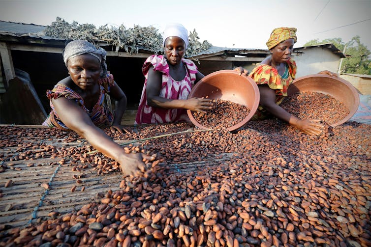 Women from a local cocoa farmers’ association spread cocoa beans to dry in Djangobo, Niable in eastern Ivory Coast.