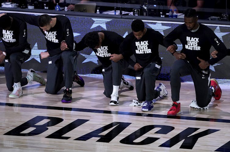 Sacramento Kings players kneel in support of the Black Lives Matter movement before an NBA basketball game, August 6, 2020.