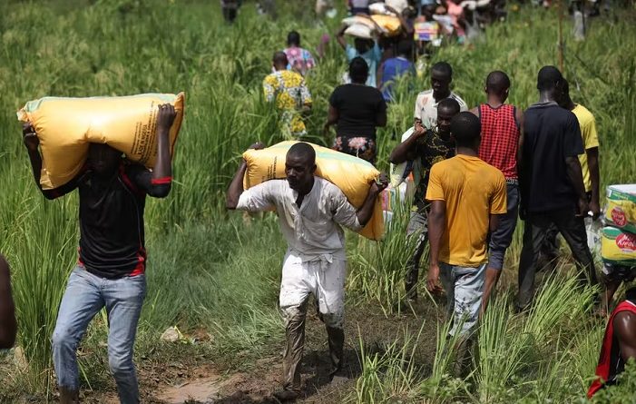 The Oasis Reporters March 15, 2022 People loot bags of food from a COVID-19 palliative warehouse in Nigeria.Photo by