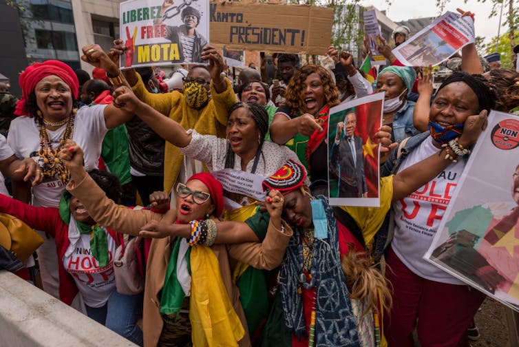 Cameroonian demonstrators in Belgium demand President Biya step down and release all political prisoners.