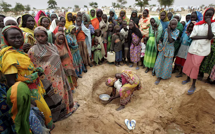 People gather around a hole being dug in search of water in Darfur, Sudan, in 2004.
