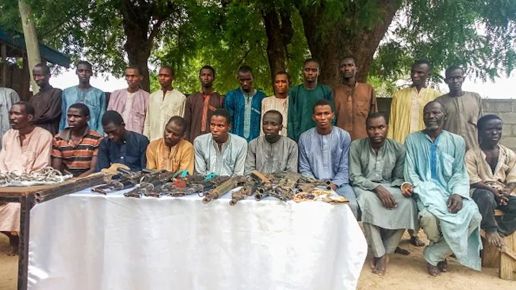 Police officers parade suspected Boko Haram militants.