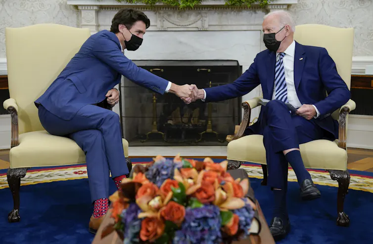 U.S. President Joe Biden shakes hands with Prime Minister Justin Trudeau as they meet in the Oval Office of the White House on Nov. 18, 2021, in Washington.