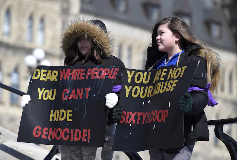 Skylar S., 15, and her sister Aponi, 12, right, whose mother is a Sixties Scoop survivor, hold signs during a national solidarity rally on Parliament Hill in Ottawa, March, 2018.