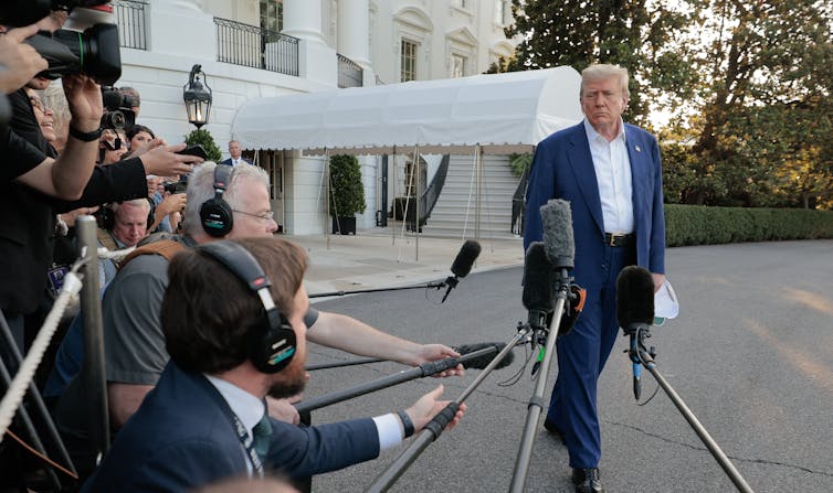 President Donald Trump speaks to reporters outside the White House on June 24, 2025, in Washington, less than 12 hours after announcing a ceasefire between Israel and Iran.