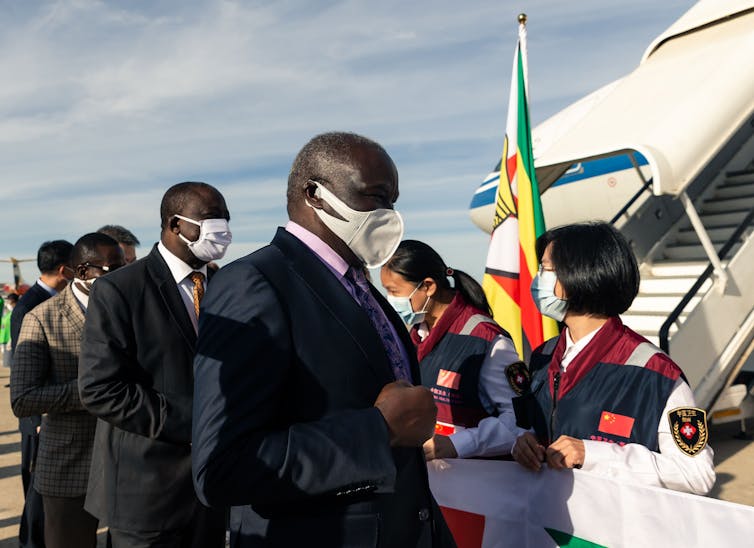 Zimbabwe leaders welcome Chinese COVID-19 experts at the Robert Mugabe International Airport in Harare on May 11, 2020.