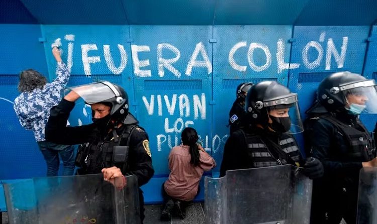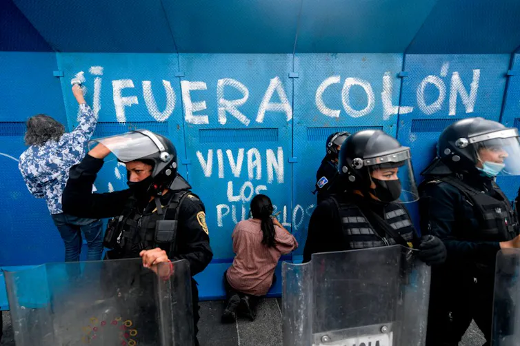 Demonstrators make graffiti reading ‘Columbus Out, Long Live the People’ on a fence protecting a statue of Christopher Columbus in Mexico City on Oct. 12, 2020.