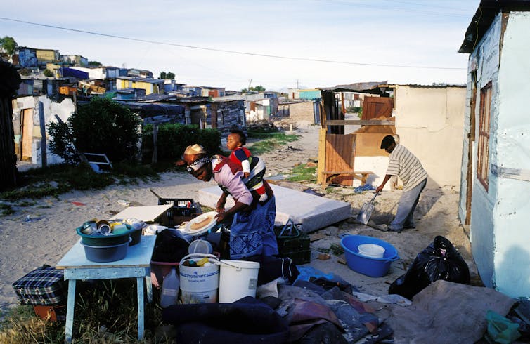 A woman with her baby collects her household goods in front of her newly built shack in Khayelitsha, outside Cape Town.