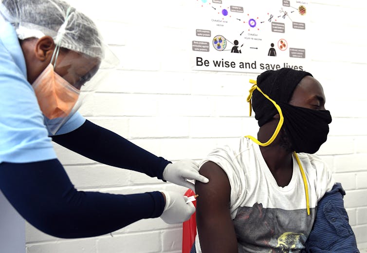 A volunteer receives an injection from a medical worker during the country’s first human clinical trial for a potential vaccine against COVID-19 in Soweto, South Africa.