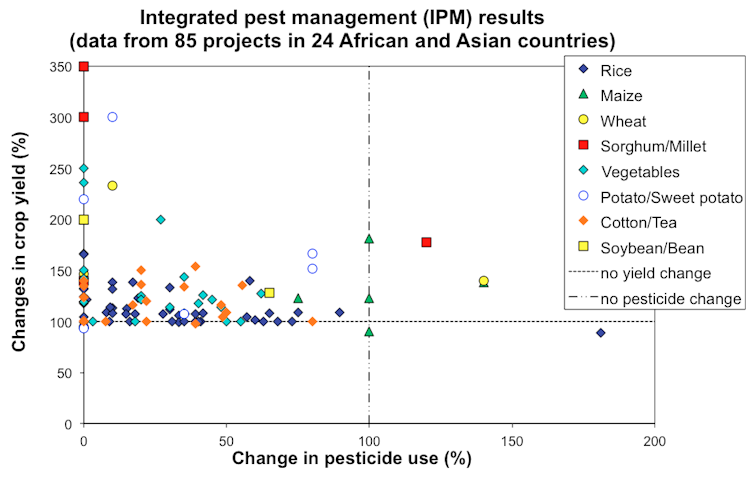 In recent research we showed that farmers in Asia and Africa have been able to cut the use of pesticides while boosting crop yields, reducing costs and delivering healthier profits. Even the landscape surrounding the farms benefits. Each kilogramme of pesticide used in agriculture imposes €3-15 (US$4-19) of external economic costs on the environment, wildlife and human health – money spent by water companies to remove them from drinking water, for instance, or the loss of valuable pollinating insects.