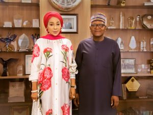 Dame (Dr.) Adaora Umeoji OON, GMD/CEO Zenith Bank PLC with the President/CE Dangote Industries Limited, Alhaji Aliko Dangote GCON, during a courtesy visit to Dangote Industries Limited in Lagos by Zenith Bank.
