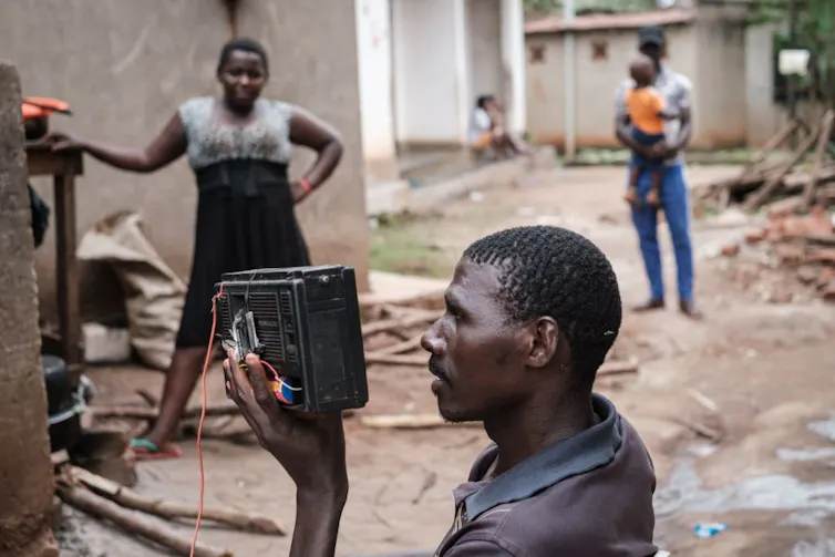 Joseph Kazibwe, with his wife Magere, listen to radio updates of the Uganda presidential election result in January 2021.