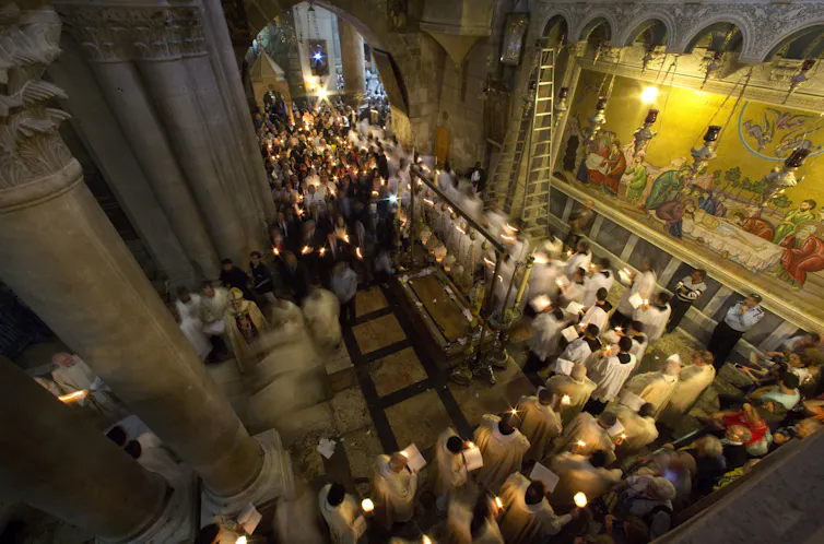 A procession at the Church of the Holy Sepulchre, believed by many Christians to be the site of the crucifixion and burial place of Jesus Christ.