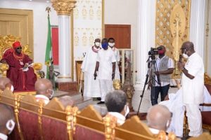 In his remarks, Obaseki thanked the monarch for his fatherly role in ensuring that the state is peaceful before, during and after the election.