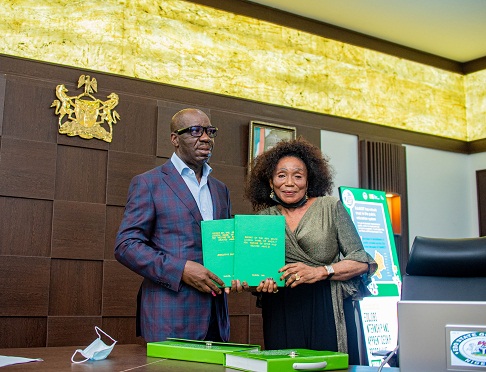 Edo State Governor, Mr. Godwin Obaseki (left) and the Chairperson of #EndSARS Judicial Panel of Inquiry, Hon Justice Ada Ehigiamusoe (Rtd), when the panel presented its report to the Governor at the Government House in Benin City, on Tuesday, July 13, 2021.