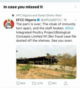 The anti-graft agency disclosed this in a tweet on Sunday, July 15, saying: “The parri is over; The cloak of immunity torn apart, and the staff broken. #Ekiti Integrated Poultry Project/Biological Concepts Limited N1.3bn fraud case file dusted off the shelves. See you soon.”