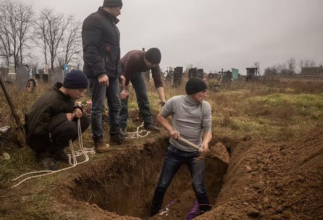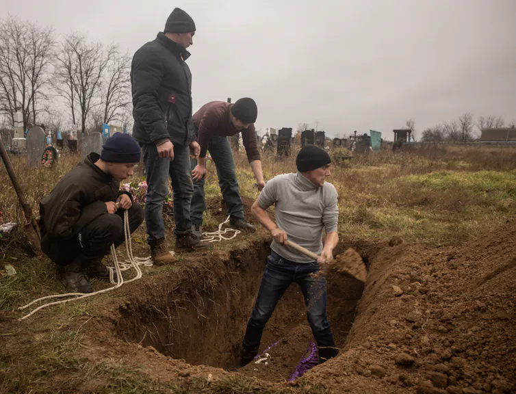 Local residents help exhume the body of a 16-year-old Ukrainian girl, killed by Russian forces, in Kherson, Ukraine in November 2022.