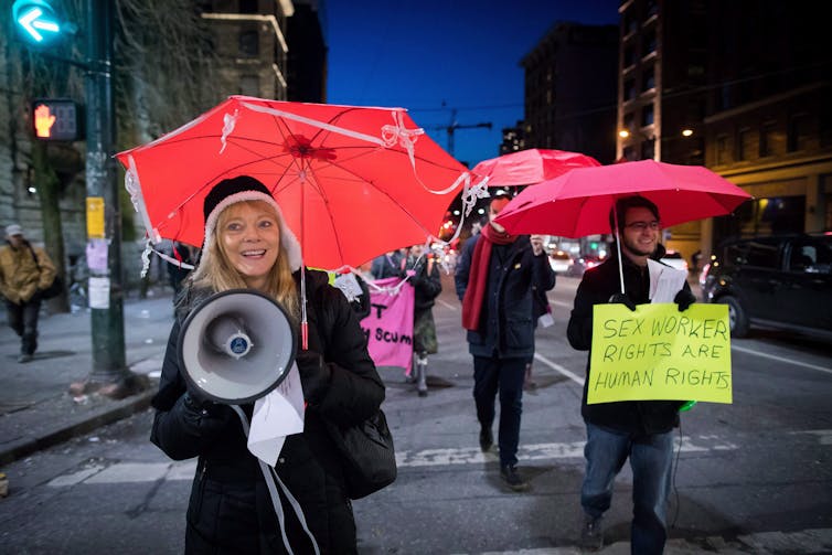 Joyce Arthur, left, a board member at the Providing Alternatives, Counselling and Education Society (PACE), leads a red umbrella march to recognize International Day to End Violence Against Sex Workers, in the Downtown Eastside of Vancouver, B.C., in December 2016.