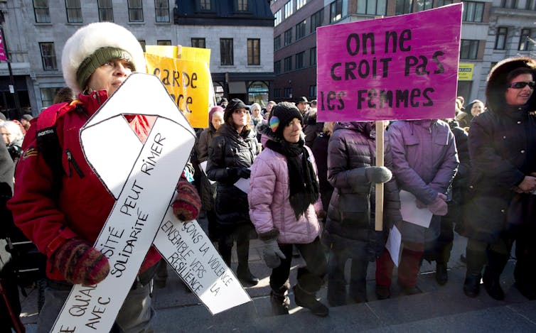 Women gather to protest against violence towards women in front of the Montreal courthouse on the anniversary of the Polytechnique massacre, where a lone gunman killed 14 women students at the University of Montreal technical school.