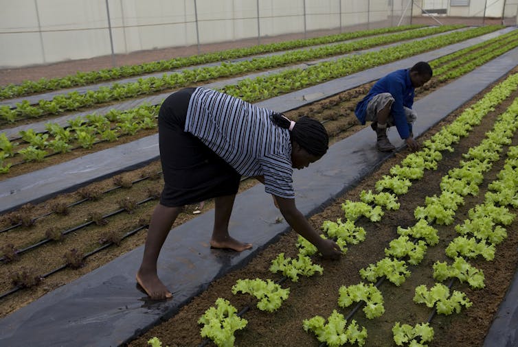 Workers in one of the poly-tunnels of an urban farm in South Africa.