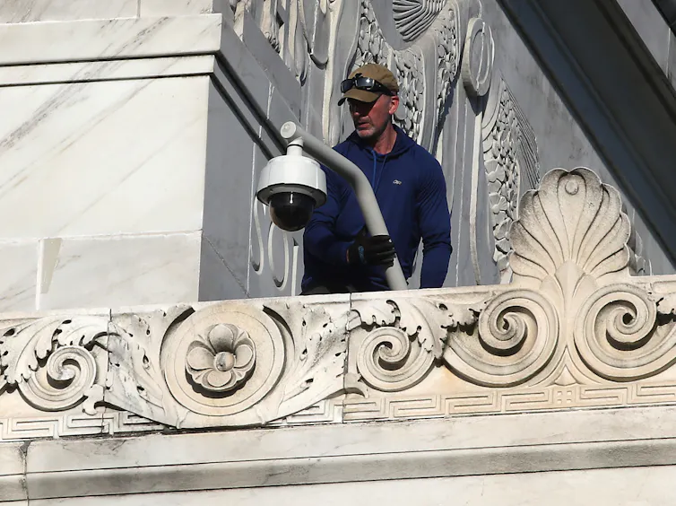 Government agencies are increasingly using facial recognition technology, including through security cameras like this one being installed on the Lincoln Memorial in 2019.
