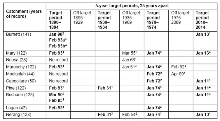 We compiled records of major floods in South East Queensland between 1890 and 2014. As the table below shows, roughly 80% of large historical floods happened within a series of five-year flood-prone periods, despite these periods together representing only 16% of the study period.