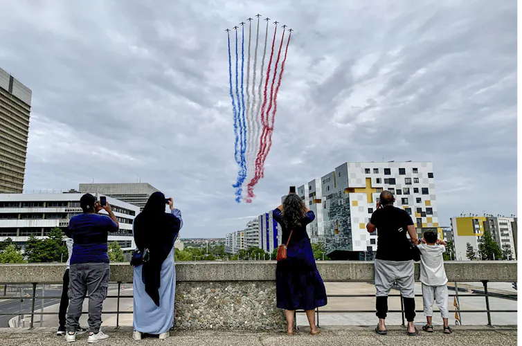 Residents watch French air force jets fly over a Paris suburb during the Bastille Day military parade on July 14, 2023.