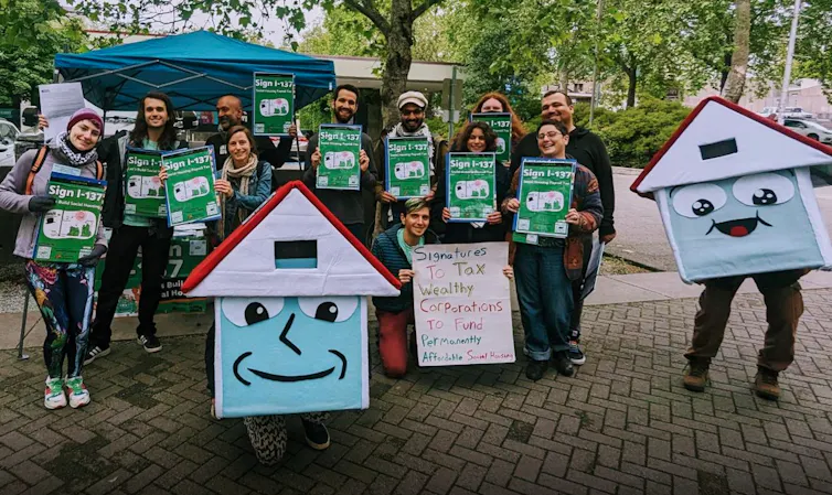 Activists in Seattle gather signatures to put a social housing initiative on the ballot. In early 2025, voters passed the measure, which implements a payroll tax on high incomes to fund the program.