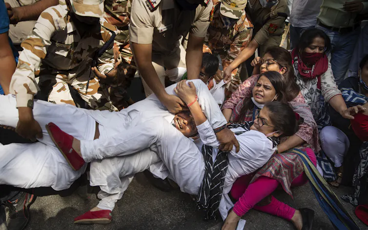 People protesting the gang rape and killing of a woman in Hathras, Uttar Pradesh, hold onto each other as policemen try to detain them in New Delhi, India, in September 2020. The gang rape of the woman from the lowest rung of India’s caste system sparked outrage across the country.