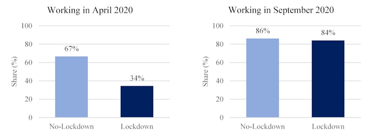 Workers in districts affected by the lockdown were more than twice as likely to drop out of work in the early phases of the pandemic. And only one out of three workers in lockdown districts continued working throughout April 2020, compared to two out of three in districts that had no lockdown.