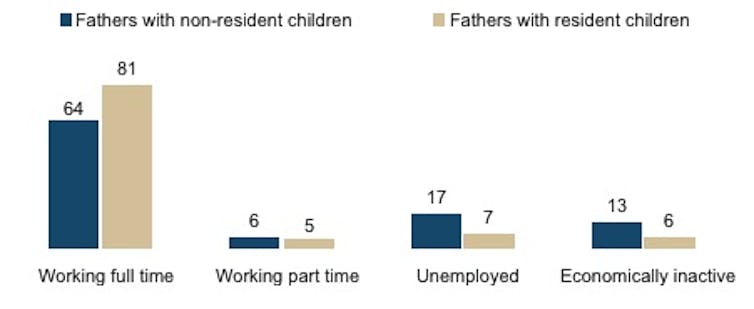 Non-resident fathers emerge as a more disadvantaged group than resident fathers. They are less likely to be in work, have educational qualifications and be a home owner. For example 25% of non-resident fathers have no qualifications and 17% are unemployed, compared with 17% and 7% of resident fathers, respectively.