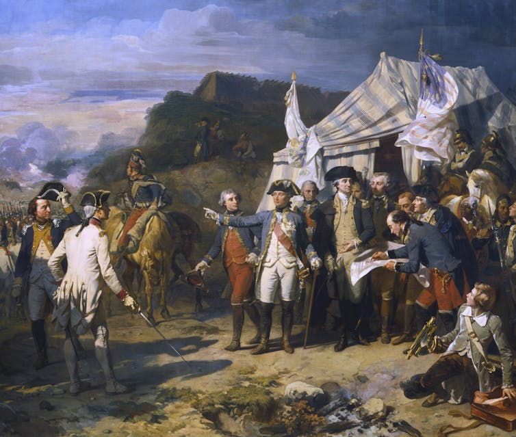 French Gen. Jean de Rochambeau and American Gen. George Washington giving the last orders in October 1781 for the battle at Yorktown, where the British defeat ended the War of Independence.