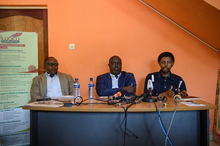Léandre Sikuyavuga (left), editor in chief of the newspaper Iwacu; Antoine Kaburahe (centre), director of the Iwacu Media Group; and Innocent Muhozi (right), director of the Renaissance radio and television stations, give a press conference at the Iwacu offices in Bujumbura on 19 May 2015, following attacks on, and closures of four private radio stations.