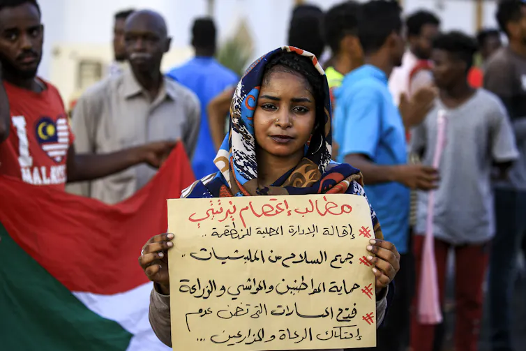 A demonstrator stands with a sign reading: “Demands: sack the local authority, disarm militias, protect citizens, cattle, and farmland, and end friction between farmers and shepherds”, during a protest in Central Darfur.