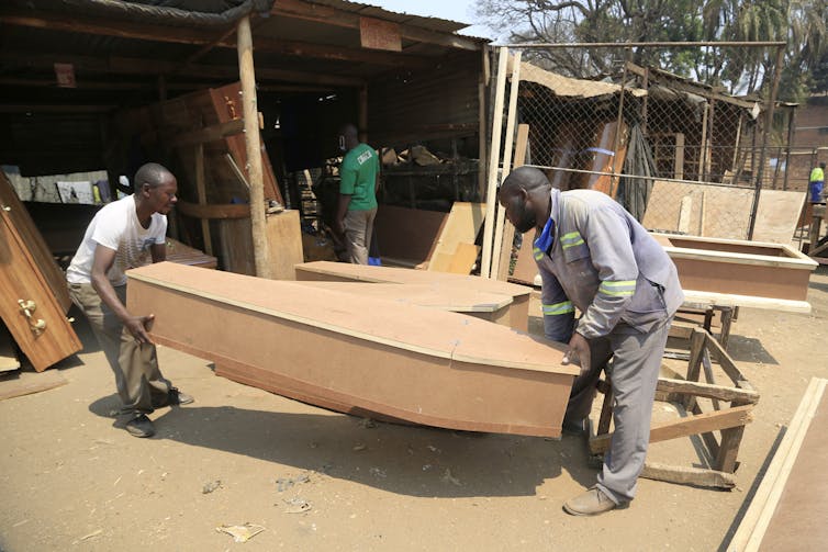 Vincent Nhidza, right, and colleague Mathew Simango, arrange coffins at a street workshop in Harare, Zimbabwe.