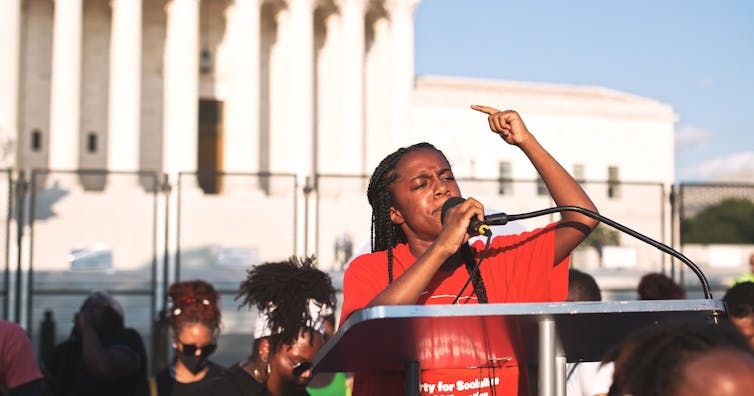 A woman speaks at a protest in Washington D.C. following the U.S. Supreme Court’s reversal of its decision in the Roe v. Wade case on abortion rights, June 24, 2022.