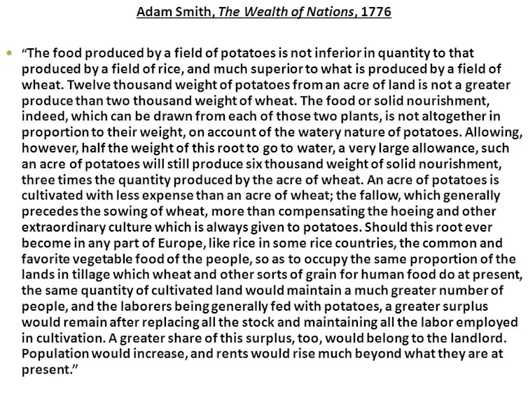 Smith linked the personal benefits individuals would derive from a greater consumption of potatoes to a greater flourishing of the economy. If planted with potatoes, agricultural land would support a larger population, and “the labourers being generally fed with potatoes” would produce a greater surplus, to the benefit of themselves, landlords and the overall economy. In Smith’s vision, as in that of William Buchan and countless other potato advocates, if individuals chose to eat more potatoes, the benefits would accrue to everyone. Better input of potatoes would result in better economic outputs.
