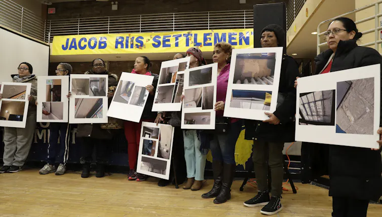 Residents of the Jacob Riis Settlement in New York City hold photographs of leaks, mold, peeling paint and other issues during a community town hall meeting on March 7, 2019.