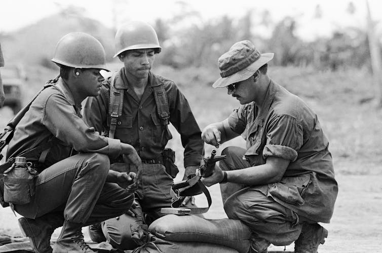 A U.S. military advisor instructs Honduran troopers in Puerto Castilla, Honduras, in 1983.