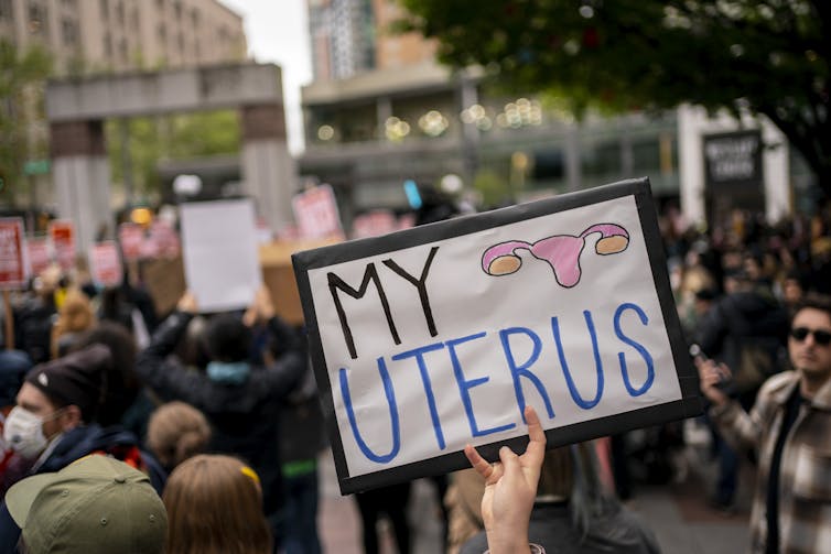 A demonstrator holds a sign during a rally in support of abortion rights on May 3, 2022 in Seattle, Washington.
