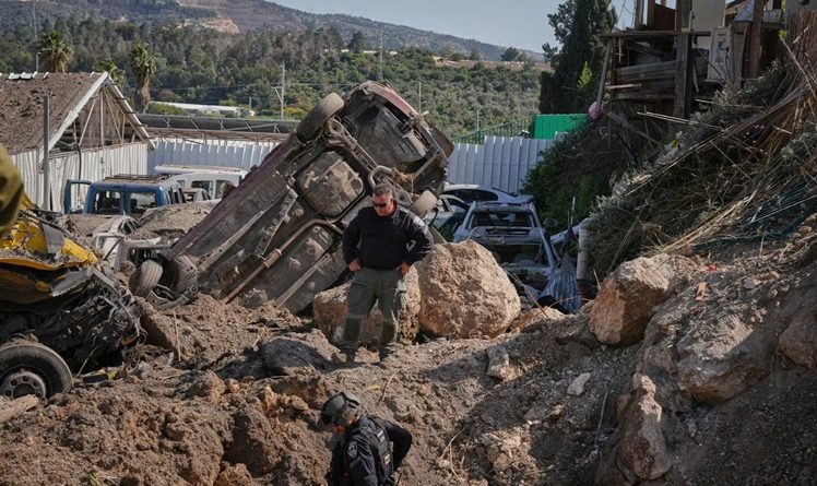 Israeli security forces examine the site of an Iranian missile strike in Eshtaol, central Israel, on March 28, 2026. (AP Photo/Maya Levin)